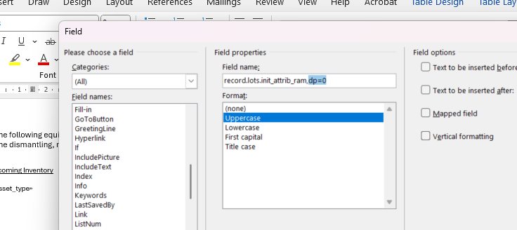 Note: If for some reason, after pasting your code (e.g ,dp=2) at the end of the Field name, Word displays one or more errors and/or does not accept the code, some users have reported that a workaround is to find a field with a similar code and copying / pasting it into your new Field name. This is an issue with Word, unrelated to RecyclyERP.